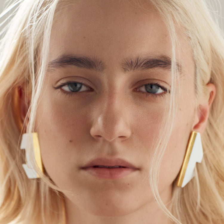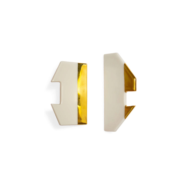 Sculptural Ear Sets made in Limoges white porcelain with 24k liquid yellow gold and organic color pigments. These are highly detailed pieces handcrafted in France by talented local artisans, whose craftsmanship guarantees to maintain the material’s position as the premier pure white decorative porcelain since the 19th century. ‘Conceptual Architectural Jewelry’, is an elevation of non-precious materials by combining them with precious ones in order to create contemporary pieces that challenge the traditional concept of value, and raises questions of reinvention, recycling, and sustainability.
