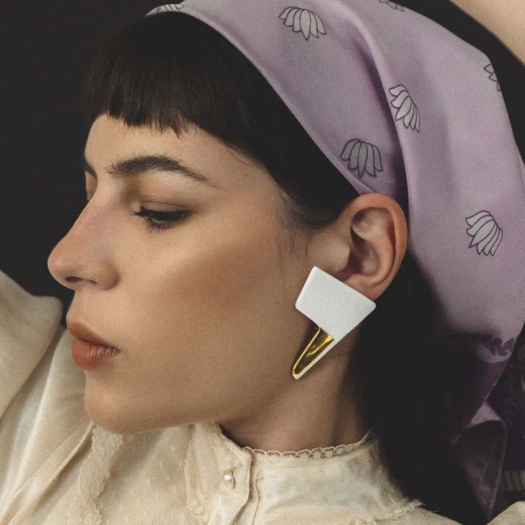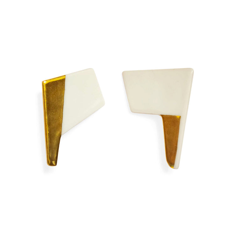 Sculptural Ear Sets made in Limoges white porcelain with 24k liquid yellow gold and organic color pigments. These are highly detailed pieces handcrafted in France by talented local artisans, whose craftsmanship guarantees to maintain the material’s position as the premier pure white decorative porcelain since the 19th century. ‘Conceptual Architectural Jewelry’, is an elevation of non-precious materials by combining them with precious ones in order to create contemporary pieces that challenge the traditional concept of value, and raises questions of reinvention, recycling, and sustainability.