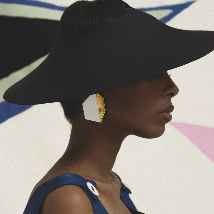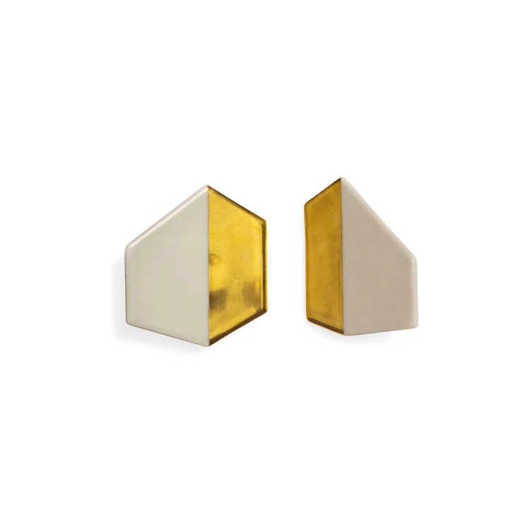 Sculptural Ear Sets made in Limoges white porcelain with 24k liquid yellow gold and organic color pigments. These are highly detailed pieces handcrafted in France by talented local artisans, whose craftsmanship guarantees to maintain the material’s position as the premier pure white decorative porcelain since the 19th century. ‘Conceptual Architectural Jewelry’, is an elevation of non-precious materials by combining them with precious ones in order to create contemporary pieces that challenge the traditional concept of value, and raises questions of reinvention, recycling, and sustainability.