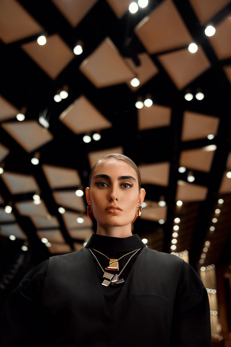 Todas las piezas se presentan en brass con baño de oro amarillo de 24 quilates y paladio, hechas a mano por artesanos Italianos y maestros joyeros. Una de las claves de la colección es que las esculturas colgantes pueden agregarse a una cadena para que cada quien cree combinaciones brutalistas únicas.