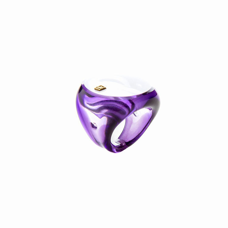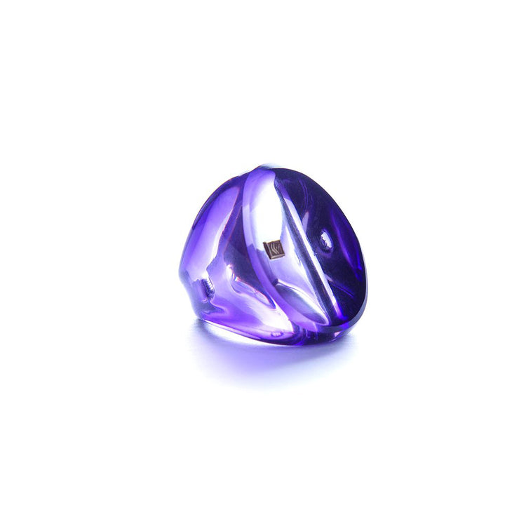 Crystal rings, cast in Italy by Venetian masters. Each piece is meticulously cast and carved by award-winning sculptors on the island of Murano, using millenary tech- niques inherited from the region’s glass families in combination with modern technology. Pieces are embellished with attaches in 18k italian gold and precious stones such as diamonds and amethysts.