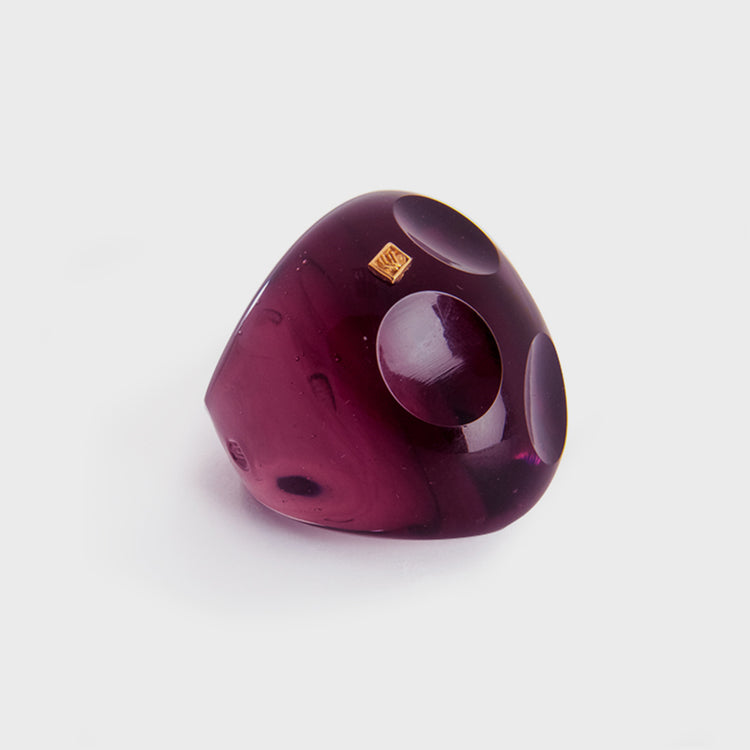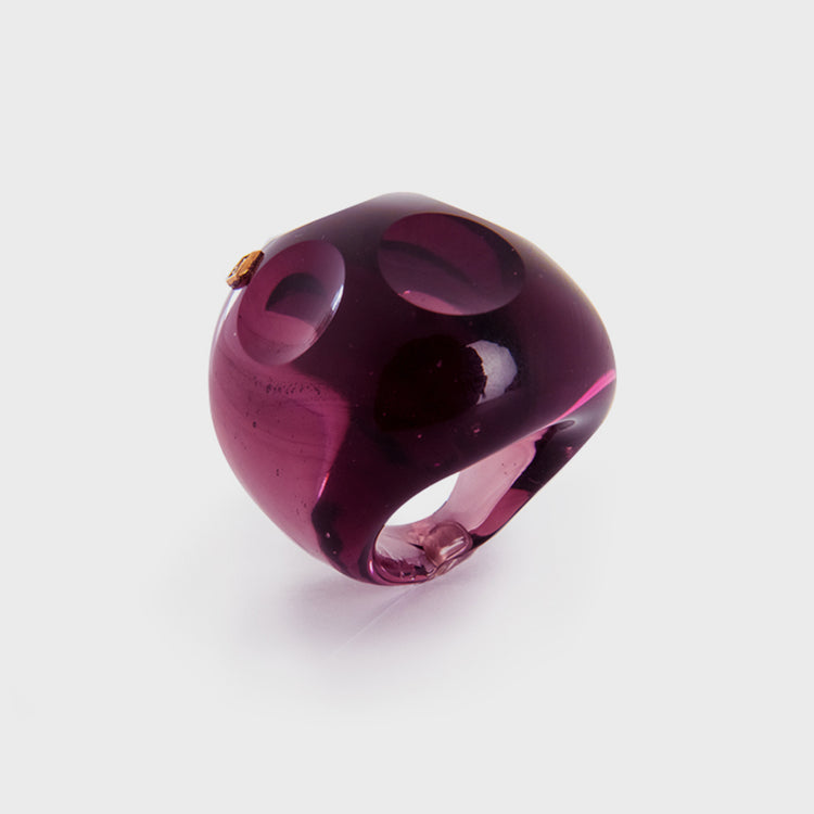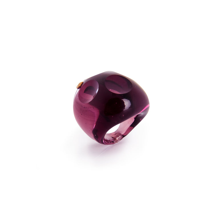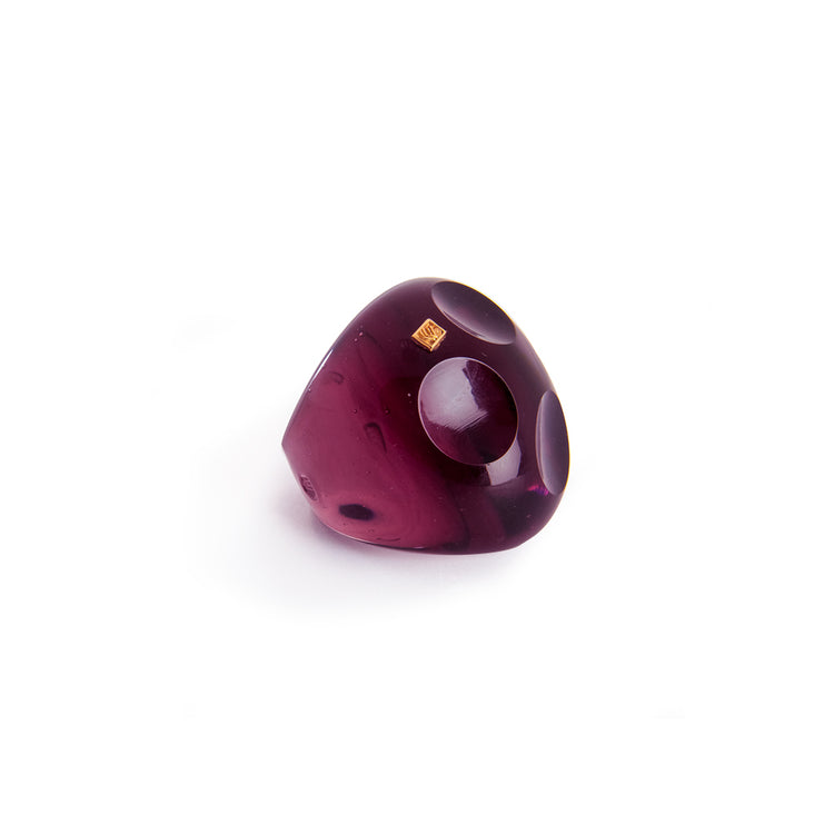 Crystal rings, cast in Italy by Venetian masters. Each piece is meticulously cast and carved by award-winning sculptors on the island of Murano, using millenary tech- niques inherited from the region’s glass families in combination with modern technology. Pieces are embellished with attaches in 18k italian gold and precious stones such as diamonds and amethysts.