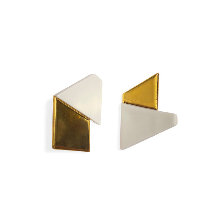 Sculptural Ear Sets made in Limoges white porcelain with 24k liquid yellow gold and organic color pigments. These are highly detailed pieces handcrafted in France by talented local artisans, whose craftsmanship guarantees to maintain the material’s position as the premier pure white decorative porcelain since the 19th century. ‘Conceptual Architectural Jewelry’, is an elevation of non-precious materials by combining them with precious ones in order to create contemporary pieces that challenge the traditional concept of value, and raises questions of reinvention, recycling, and sustainability.