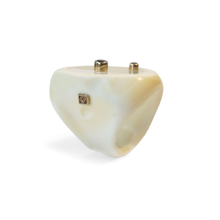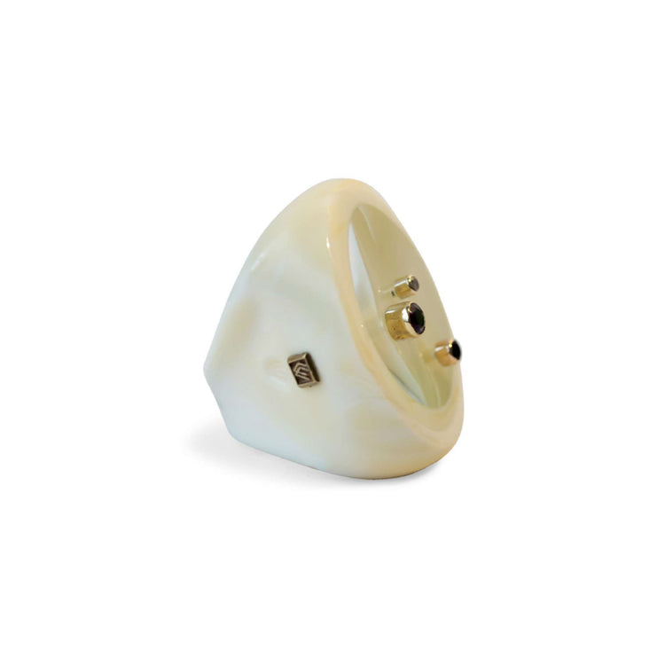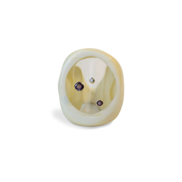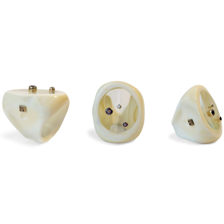 Crystal rings, cast in Italy by Venetian masters. Each piece is meticulously cast and carved by award-winning sculptors on the island of Murano, using millenary tech- niques inherited from the region’s glass families in combination with modern technology. Pieces are embellished with attaches in 18k italian gold and precious stones such as diamonds and amethysts.