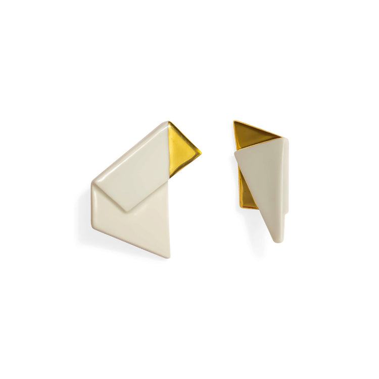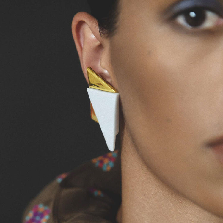 Sculptural Ear Sets made in Limoges white porcelain with 24k liquid yellow gold and organic color pigments. These are highly detailed pieces handcrafted in France by talented local artisans, whose craftsmanship guarantees to maintain the material’s position as the premier pure white decorative porcelain since the 19th century. ‘Conceptual Architectural Jewelry’, is an elevation of non-precious materials by combining them with precious ones in order to create contemporary pieces that challenge the traditional concept of value, and raises questions of reinvention, recycling, and sustainability.