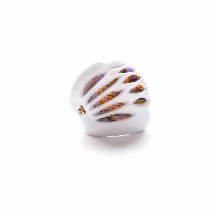 Crystal rings, cast in Italy by Venetian masters. Each piece is meticulously cast and carved by award-winning sculptors on the island of Murano, using millenary tech- niques inherited from the region’s glass families in combination with modern technology. Pieces are embellished with attaches in 18k italian gold and precious stones such as diamonds and amethysts.