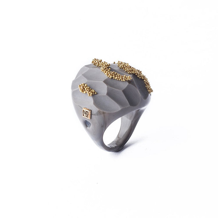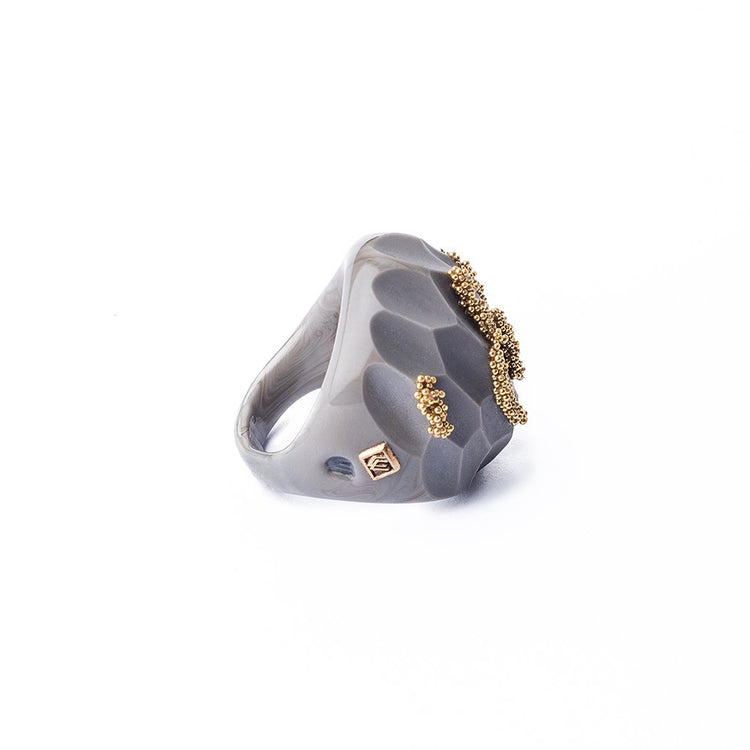Crystal rings, cast in Italy by Venetian masters. Each piece is meticulously cast and carved by award-winning sculptors on the island of Murano, using millenary tech- niques inherited from the region’s glass families in combination with modern technology. Pieces are embellished with attaches in 18k italian gold and precious stones such as diamonds and amethysts.