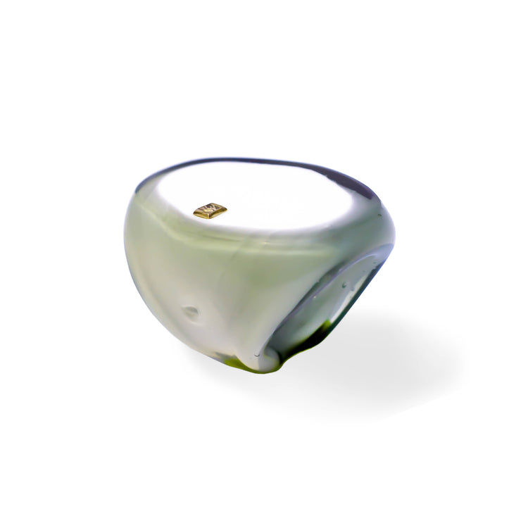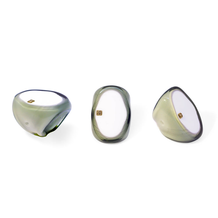 Crystal rings, cast in Italy by Venetian masters. Each piece is meticulously cast and carved by award-winning sculptors on the island of Murano, using millenary tech- niques inherited from the region’s glass families in combination with modern technology. Pieces are embellished with attaches in 18k italian gold and precious stones such as diamonds and amethysts.